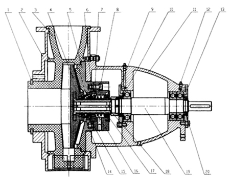 11、托架     12、黄油嘴     13、轴承后盖  14、机械密封动环  15、机械密封静环